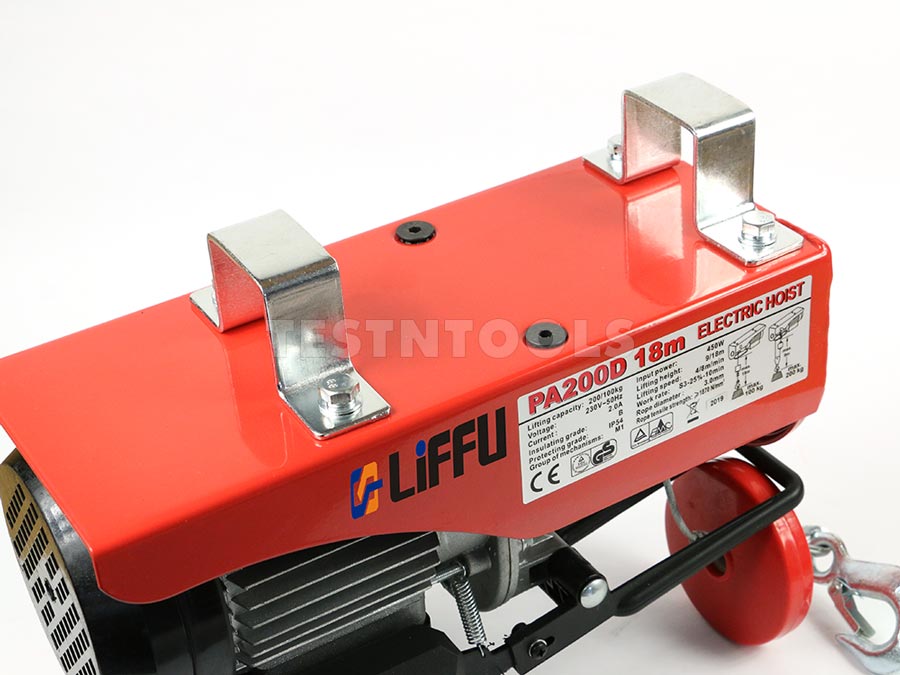 This hoist (which can also pull like a winch) bolts onto an overhead i-beam, box section steel, or Liffu gantry trolley to make easy work of any lifting jobs you have around the workshop.